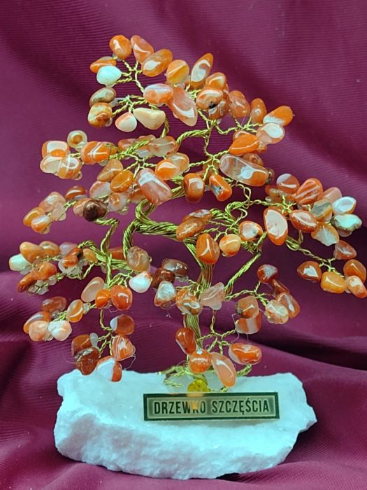 Bardzo ładne drzewko szczęścia "Bonsai" z kamieni naturalnych - karneolu - na pniu z drutu mosiężnego i podstawie z marmuru.