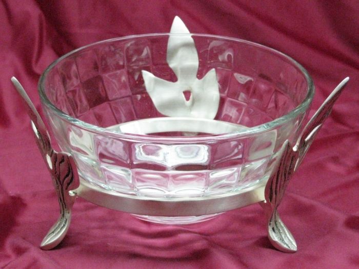 Bardzo ładna szklana owocarka na podstawie z mosiądzu srebrzonego(warstwą ok.20 mikronów).Produkt najwyższej jakości, o niepowtarzalnym wzornictwie. (Nr prod.: 2269/P-RC11/1448)