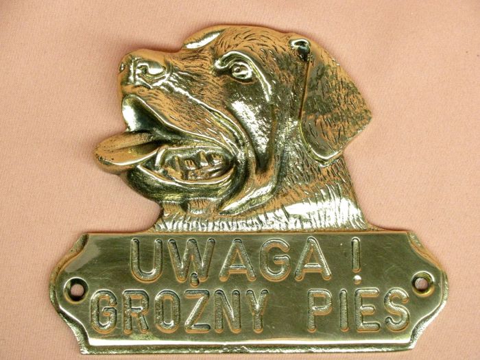 Mosiężna oksydowana tabliczka do powieszenia na ścianie lub płocie ostrzegająca o grożnym psie. (Nr prod.: 1993/WP-341A)